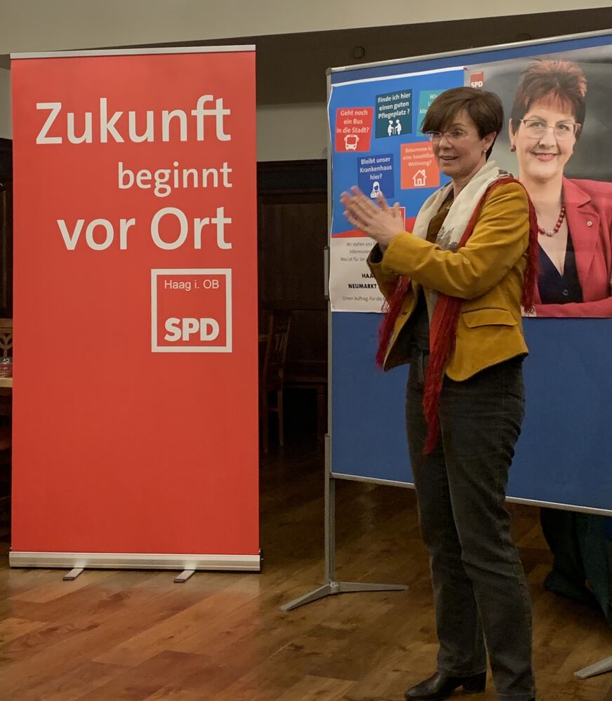 Bürgermeisterin Schätz eröffnete den Abend mit einem Hinweis auf einen Artikel im Donaukurier, in dem der Haager CSU-Vorsitzende in einem Interview zur Kommunalwahl in Haag zitiert wird: "Es braucht einen Neuanfang, unser Ort ist vom Niedergang bedroht" (Fundstelle: https://www.donaukurier.de/nachrichten/bayern/Buergermeister-gesucht;art155371,4392422). "Sieht Haag so aus, als sei es vom Niedergang bedroht?", fragte Sissi Schätz die Zuhörer. Welche Gemeinde könne es sich schon leisten, ein Hallenbad zu erhalten, sein Wahrzeichen zu sanieren und neu zu gestalten, ein neues Kino-Cafe und das neue Pfarrheim im Zehentstadel zu planen? Sie strebe ein moderates Wachstum des Ortes an, in dem sich die Menschen wohlfühlen und sich auch in 20 Jahren noch auf der Straße grüßen. Haag habe eine starke Stellung im Landkreis Mühldorf, da es als zentraler Ort im westlichen Landkreis über eine Infrastruktur verfüge, die normalerweise ein Ort dieser Größe nicht aufweisen könne. Als Beispiele nannte sie das Krankenhaus und die Realschule. Starken Verbesserungsbedarf gebe es beim ÖPNV. Richard Fischer, Vorsitzender der Kreistagsfraktion bekräftigte dies. Es sei der Kreistags-SPD zu verdanken, dass beim ÖPNV endlich etwas in Bewegung komme, besonders habe sich Sissi Schätz bei landkreisübergreifenden Verbindungen nach Dorfen und Wasserburg sowie beim Thema "Aufnahme in das MVV-Gebiet" engagiert. Landratskandidatin Angelika Kölbl stellte ihre Ziele für den Landkreis vor. Die medizinische Versorgung dürfe sich nicht ausschließlich an der "Schwarzen Null" orientieren, entscheidend sei eine gute Patientenversorgung. Auch sie mahnte einen besseren ÖPNV im gesamten Landkreis an. Mehr Engagement des Landkreises ist beim sozialen Wohnungsbau und der Schaffung von Pflegestützpunkten erforderlich. Um die Themen Inklusion, Notfallversorgung und Barrierefreiheit gab es regen Diskussionsbedarf.